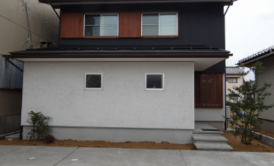 ブラック・ホワイト・ブラウンの3色を使用した住宅です。窓の形や配色がおしゃれで、モダンな雰囲気に仕上がった住宅ですね。